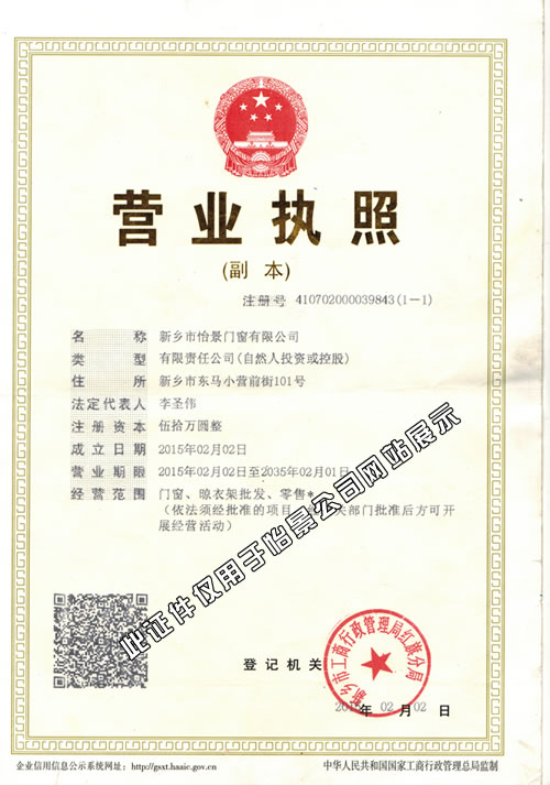 新鄉市怡景門窗有限公司是一家集生產、銷售、安裝、售后及技術服務為一體的專業化門窗企業。從個體工商戶“新鄉市紅旗區平原怡景裝飾部”到如今的”新鄉市怡景門窗有限公司”,怡景始終堅持“品質鑄就品牌”的發展戰略,主要產品有:隱形紗窗、隱形紗門、防盜防護紗窗、框中框紗窗、金剛網紗窗、金剛網紗門、蜂巢折疊門,遮陽簾,蜂巢簾,隱形防盜防護窗、新型鋁合金防盜窗、推拉活動開啟防盜窗、復合防盜窗、晾衣架批發等,所有產品均可按照客戶要求,根據客戶戶型、形狀特征和大小,為客戶“量身設計定做”相應的款式、顏色等。