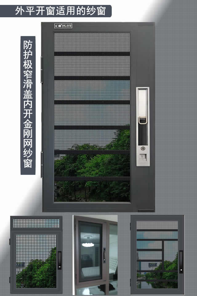 紗窗內裝內開,滑蓋開口設計,避讓關窗時的玻璃窗把手;