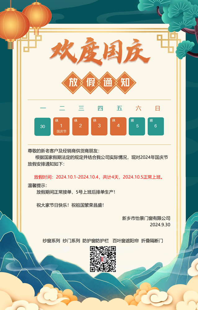 根據(jù)國家假期法定的規(guī)定并結(jié)合我公司實際情況,現(xiàn)對2024年國慶節(jié)放假安排通知如下:放假時間:2024.10.1-2024.10.4,共計4天,2024.10.5正常上班。