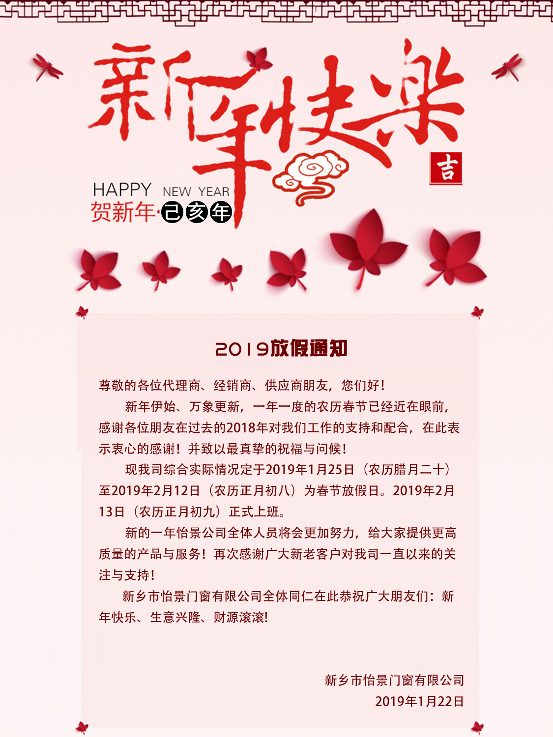 新鄉(xiāng)市怡景門窗有限公司全體同仁在此恭祝廣大朋友們:新年快樂、生意興隆、財(cái)源滾滾!