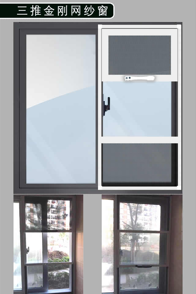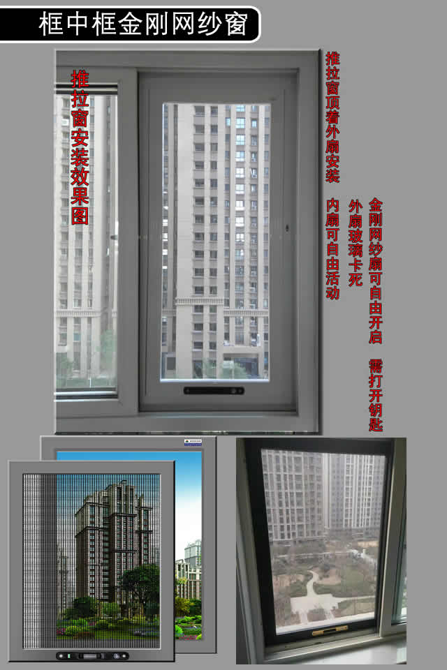 2、框中框金鋼網紗窗3、三推金鋼網紗窗